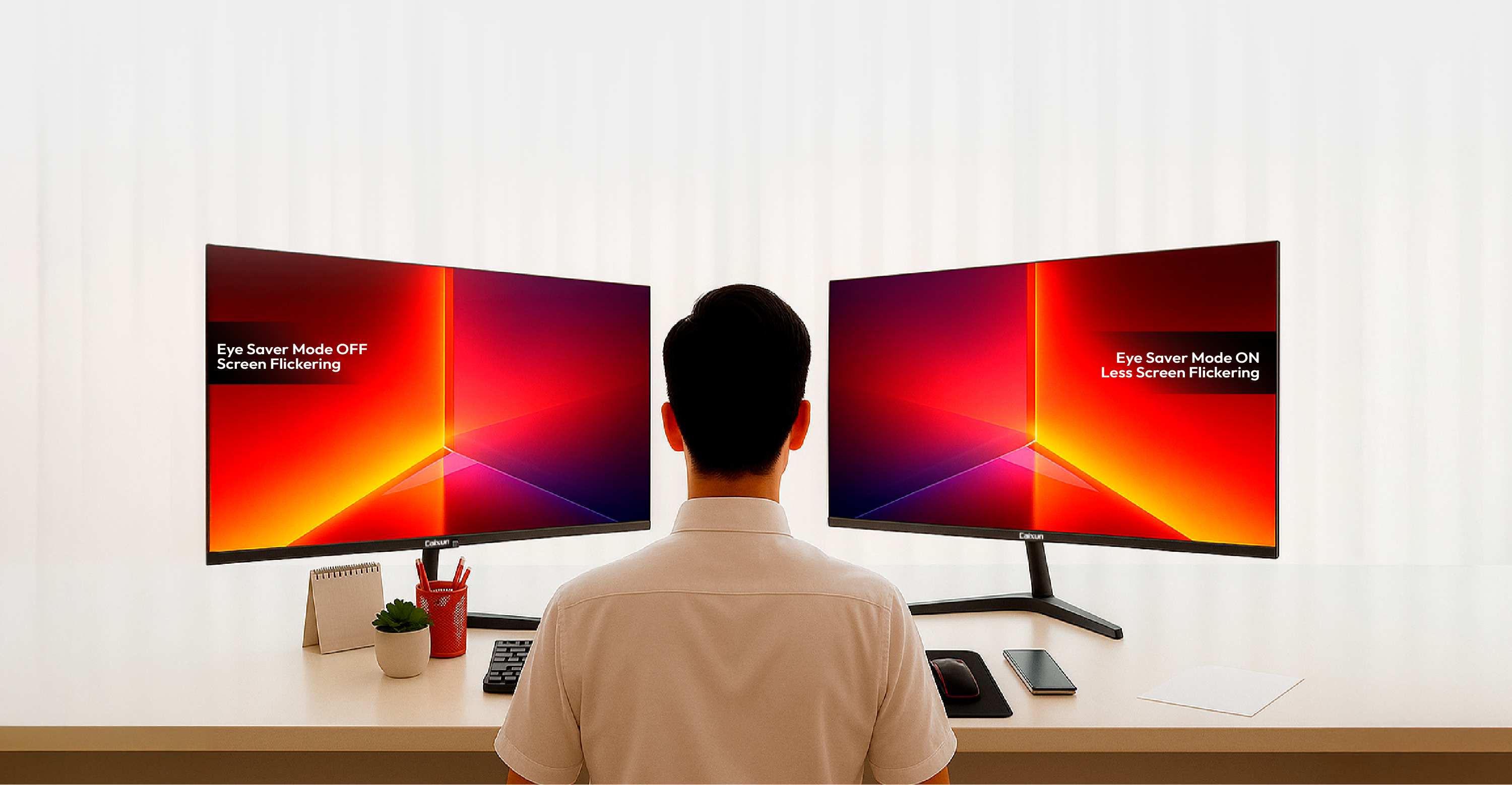 El monitor Caixun incorpora tecnología Anti-Flicker y Low Blue Light, reduciendo el parpadeo y la luz azul dañina. Disfruta sesiones más cómodas y prolongadas frente a la pantalla sin fatiga visual.